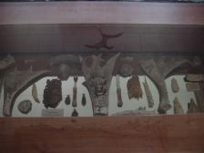 The glass table top is 1/2" thick plate glass with a 1'" bevel around it the entire border... the underside is sand blasted with moose and forest tree's, the table is slighly over 7' long and has a shadow box built in the center. ALL carvings seen are also included but could also be replaced with anything you desire. On the underside of the table are over 25 moose palms hanging down around the whole table. The chairs are matched sets of moose antlers that cradle the cushions that have tapestry of a wildlife scenes, the two end chairs have antler arm rests and all the chairs have a solid oak platform that even more moose palms hang down as support. Also included with the table is the ceiling light, theere are several moose palms surrounding the light that cast shadows on the walls of the camp for atmosphere. The table is breathtaking and would be the perfect addition to your rustic camp,home or office, for more pictures plese check the other listing for this item, for more information please contact jackbrown@bonecarver.com 716-498-3035 ....shipping is not included, pick up at location only. |